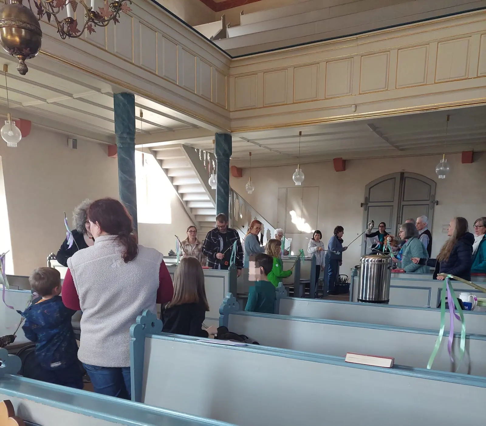 Zum Familiengottesdienst am Sonntag, 22.03.2026, der vom Kinderkirchenteam vorbereitet und gestaltet wurde, kamen in der Sandbacher Kirche nicht nur einige große und kleine Leute zusammen, sondern auch Ochse Olaf und Esel Ferdi schauten vorbei. Gemeinsam mit ihnen reisten wir gedanklich circa 2000 Jahre zurück und erlebten, wie Jesus auf einem Esel reitend in Jerusalem einzog und die Menschen mit seiner außergewöhnlichen Art und seinen Wundertaten begeisterte. Wir erfuhren, dass sich ein wirklicher König durch Freundlichkeit, Nächstenliebe und Bescheidenheit auszeichnet. Diese Botschaft können wir auch heutzutage weitertragen. Darüber hinaus gab es fröhliche, vorösterliche Bewegungslieder zum Mitmachen sowie Fürbitten, bei denen Kinder, Eltern und Konfis tatkräftig unterstützen und für Frieden und Gerechtigkeit beteten. Abgerundet wurde der Gottesdienst mit einem Segen mit Rosmarinzweigen sowie anschließendem gemeinsamen Beisammensein mit Kaffee, Tee und Gebäck.